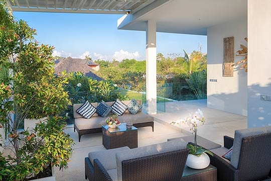 Open-air fan-cooled living and dining pavilion; poolside breakfast balé; rooftop lounge. |